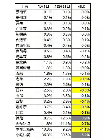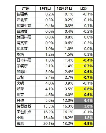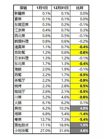 品类变化中:粤菜严重缩水、小吃快餐品类扩大、其他类扩大、