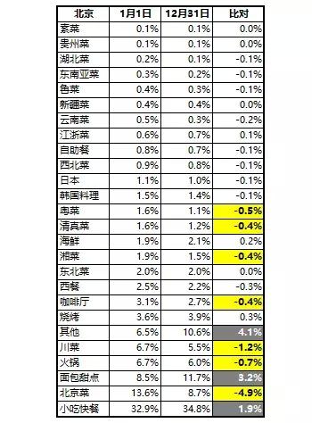 品类变化中:北京菜严重缩水、其他类扩大、面包甜点品类扩大、