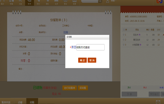 4)反结账只能更改结账方式、退菜和赠菜,不能加菜;退菜必须说明原因。