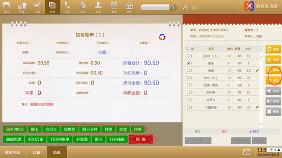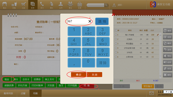 步骤一:完成点菜下单,直接进入结账界面,在结账界面选择你的结账方式,如:现金结账,点击现金,界面弹出消费金额,点击确定,回到账单界面。