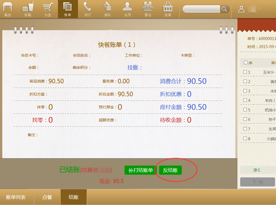 2)若要改动账单,则点击结账,在已结账单页面下点击反结账。