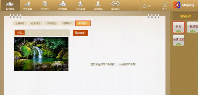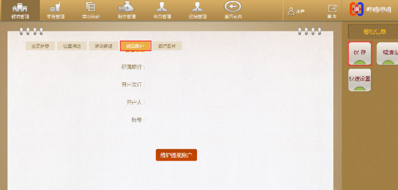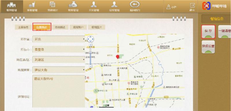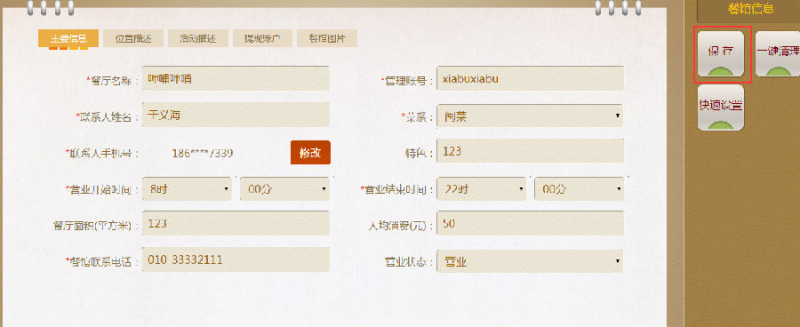 在进入后台后,会直接默认进入餐厅的常用信息。包括主要信息,位置描述,活动描述等,进行操作完后点击保存。