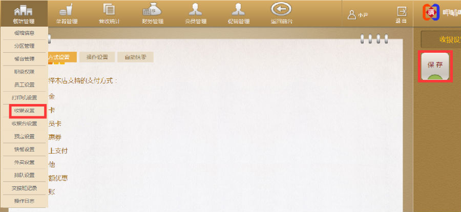 步骤二:进入后台后,点击餐馆管理【收银设置】输入支付方式设置,点击【保存】