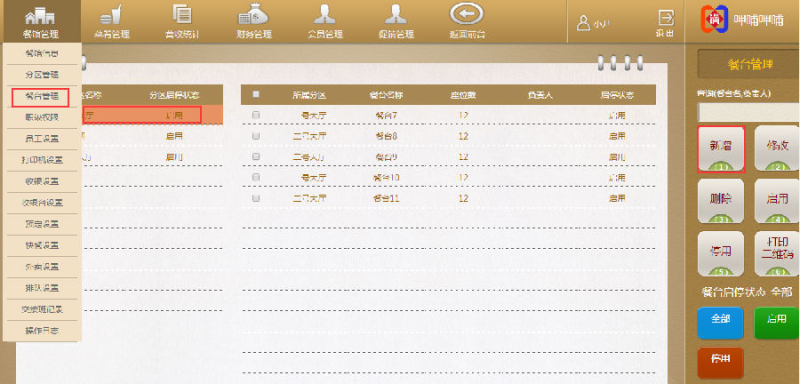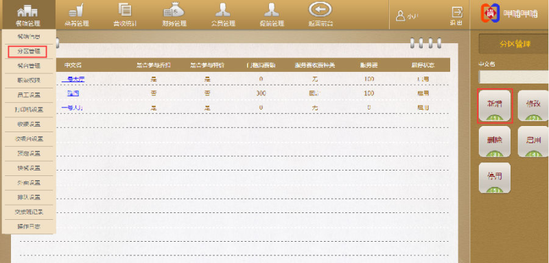 步骤五:设置完分区后点击【餐台管理】进入设置,先点击左面的餐台分区名称,再点击【新增】添加具体的餐台信息。