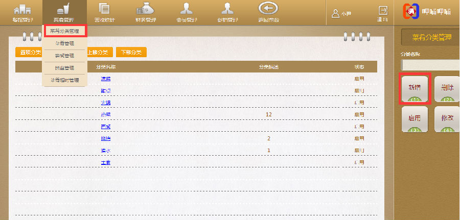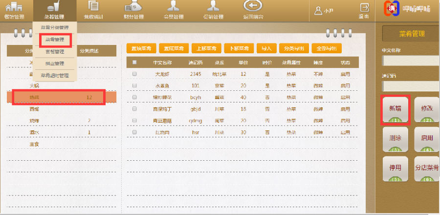 步骤一:菜肴管理点击【菜肴管理】后点击左面的分类名称,如(热菜)再点击【新增】输入热菜名称,如(大龙虾,水煮鱼,宫保鸡丁等)
