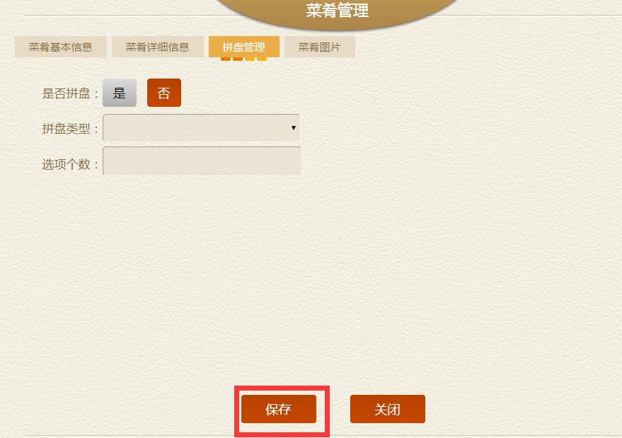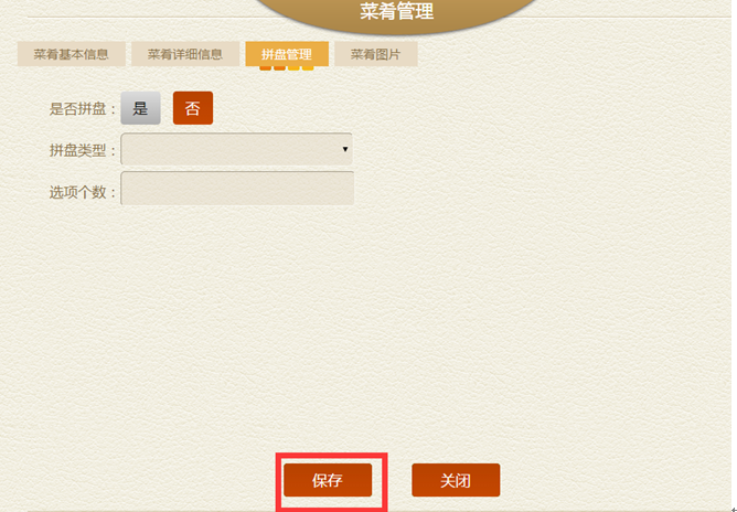 步骤四:点击拼盘管理输入是否拼盘,拼盘类型,选项个数,点击【保存】