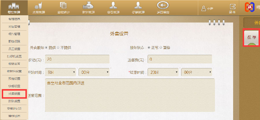 步骤一:点击进入后台,点击餐馆管理【外卖设置】输入相关信息,点击【保存】即可。