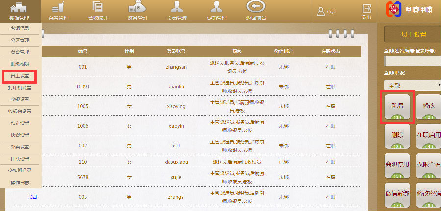 步骤二:进入后台后点击餐馆管理【员工设置】再点击【新增】