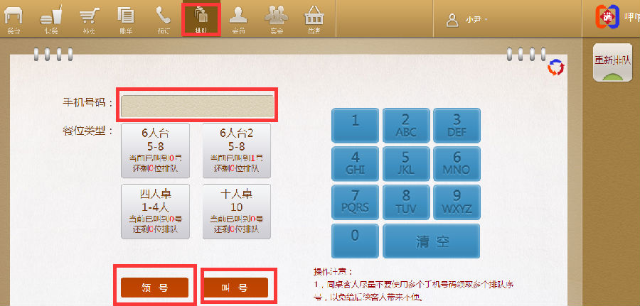 步骤一;点击【排队】输入客户的手机号码,选择【餐厅类别】点击领号或叫号。也可重新排号。
