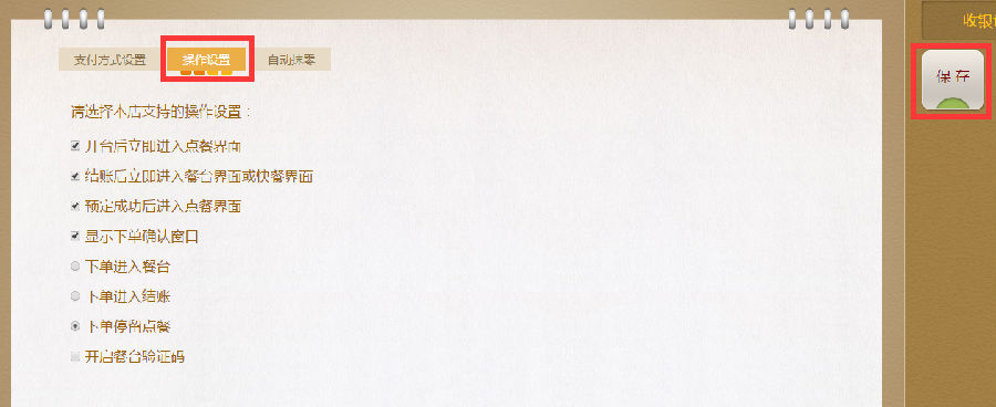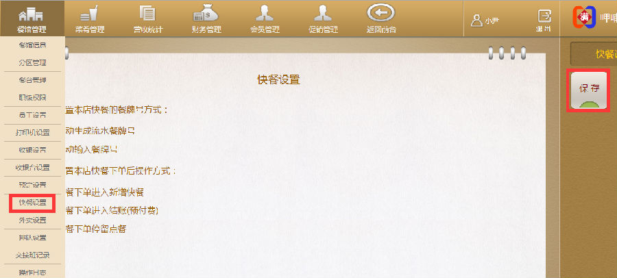 步骤一:点击进入后台,点击餐馆管理【快餐设置】选择好设置点击【保存】