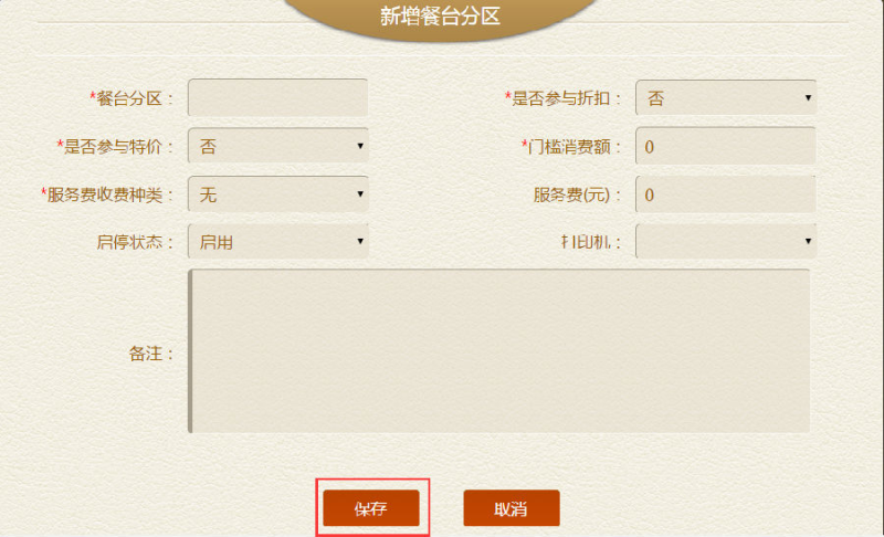 步骤三:点击新增后输入餐台分区名称如(一号大厅)等,是否参与特价,是否参与折价,门槛费,服务费等,都可设置添加后,点击【保存】