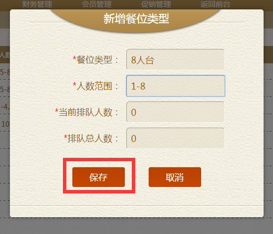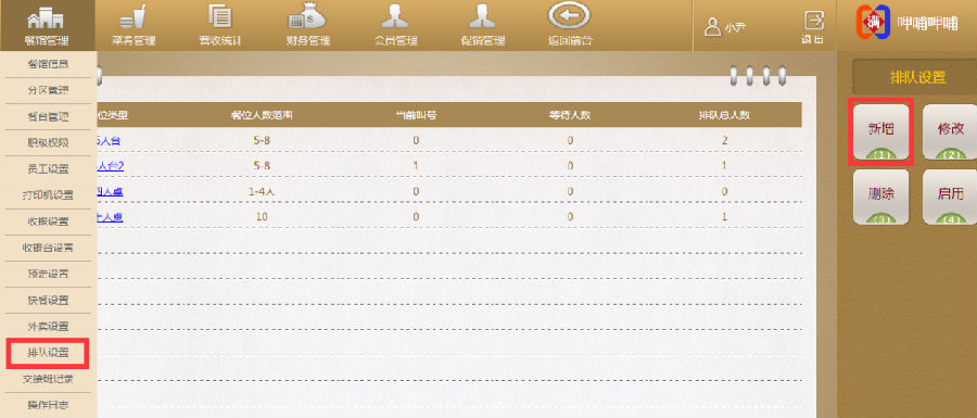 步骤二:进入后台后,点击餐馆管理【排队设置】点击【新增】输入餐位类别。