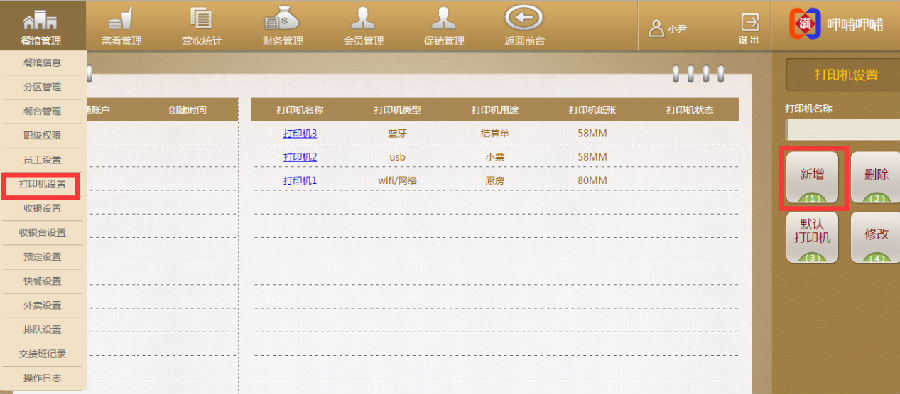 步骤二:进入后台后,点击餐馆管理【打印机设置】点击【新增】输入打印机名称。