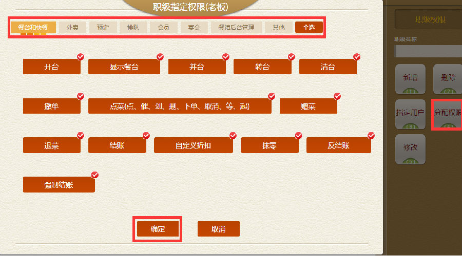 步骤四:确定后先点职级名称如老板,再点击【分配权限】把设置员工权限打上对勾!老板全选即可