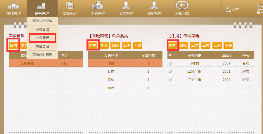 步骤一:菜肴管理点击套菜管理从左到右新增,先新增套餐管理,再新增套餐包含品类,其次新增包含菜肴,如(圣诞套餐)