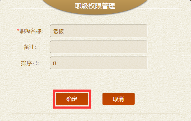 步骤三:点击新增后输入职级名称,备注,排序号。如输入(老板)