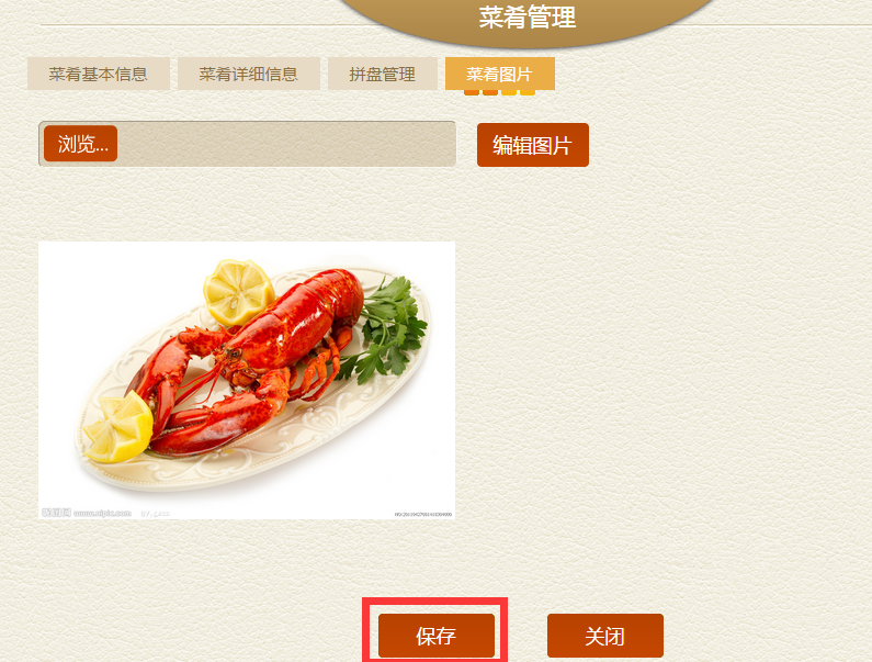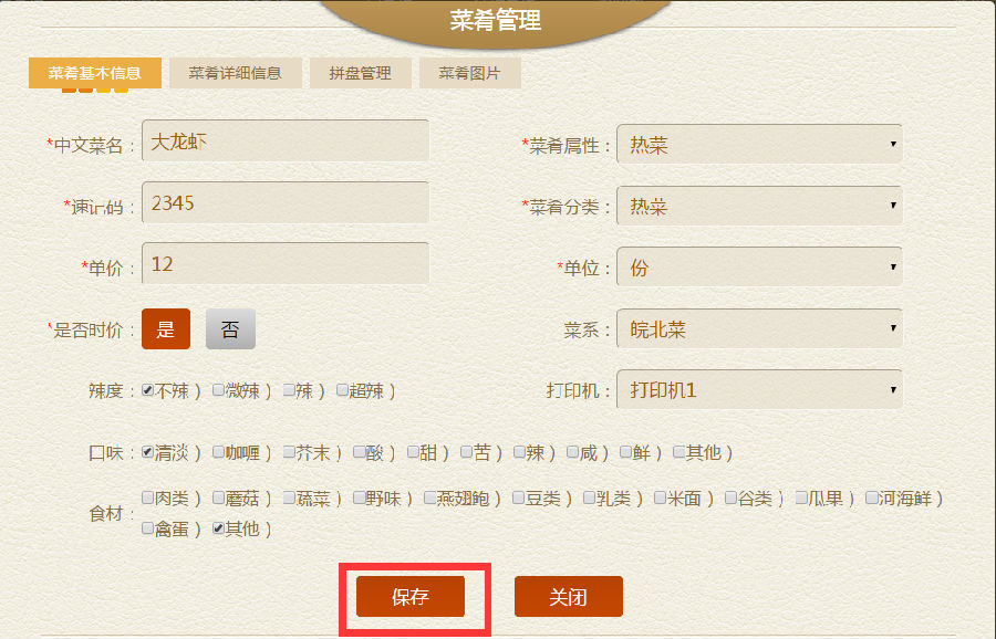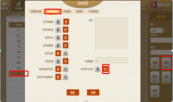步骤三:点击菜肴详细信息,设置是否称重菜,是否外卖,是否招牌菜,是否在售,是否估清在是否上打上对勾,和估清数量的填写,以及菜品是否参与折扣,点击【保存】