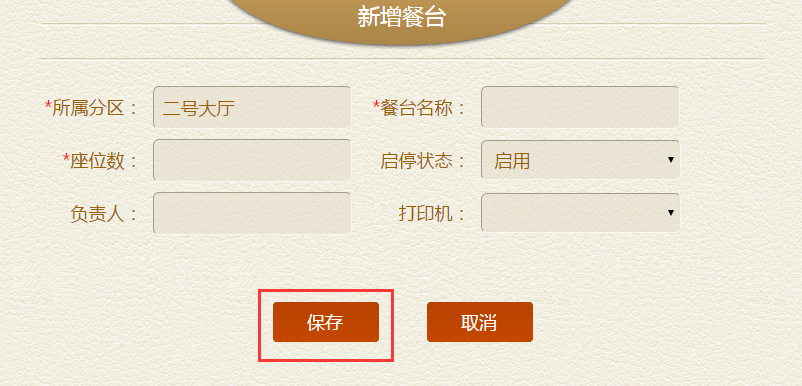 步骤六:点击新增后输入所属分区,餐台名称, 座位号等,点击【保存】