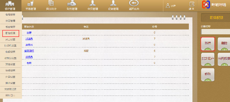 满客宝支持餐厅多种角色的设置,默认的角色有餐厅老板、餐厅主管、收银员、服务员、后厨、派送员等,餐厅也可以根据自己的实际情况进行角色的添加或者修改。