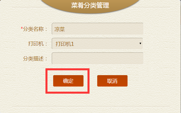 步骤三:点击新增后输入分类名称,打印机,描述,如凉菜。点击【确认】