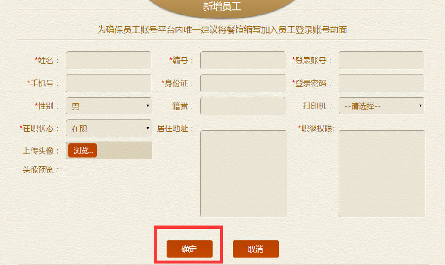 步骤三:点击新增后输入员工的姓名,性别,身份证,籍贯等,和职级权限上打上对勾。点确定。