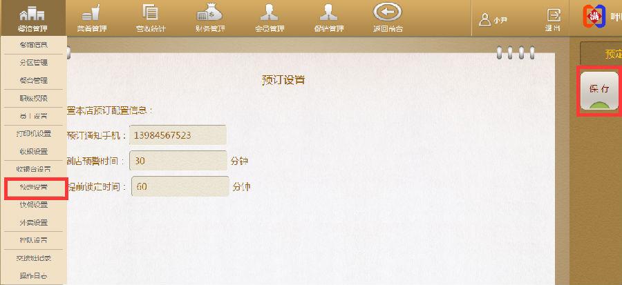 步骤二:进入后台后,点击餐馆管理【预定设置】输入内容后,点击【保存】