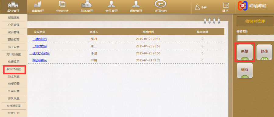 步骤二:进入后台后,点击餐管管理【收银台设置】点击【新增】