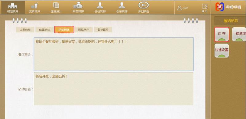 图片三:活动描述输入餐厅简介,活动公告,点击【保存】