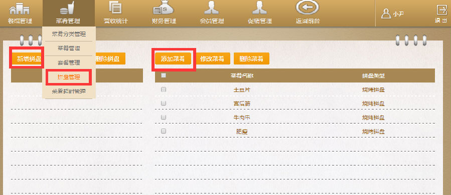 步骤一:菜肴管理点击拼盘管理,从左到右新增,先新增拼盘名称,再新增菜肴名称,如(烧烤套餐)