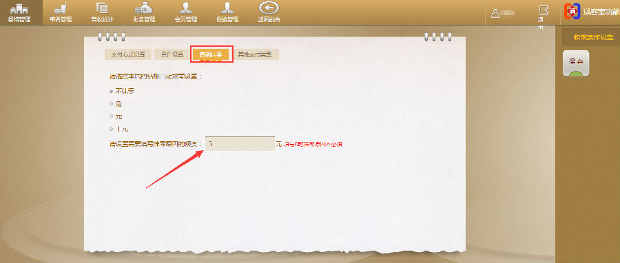 步骤二:点击自动抹零,按餐厅需求设置需要填写抹零原因的额度。点击“保存”按钮即可。