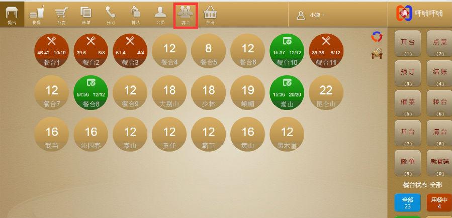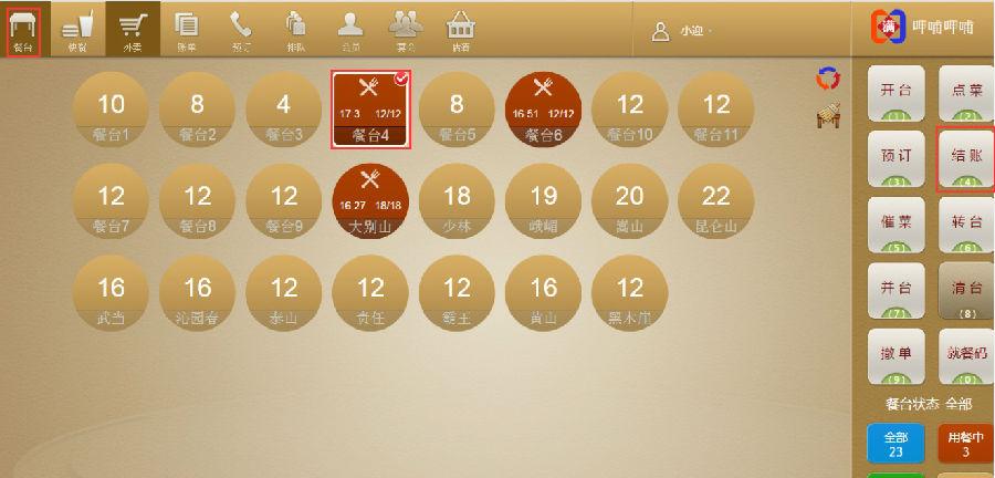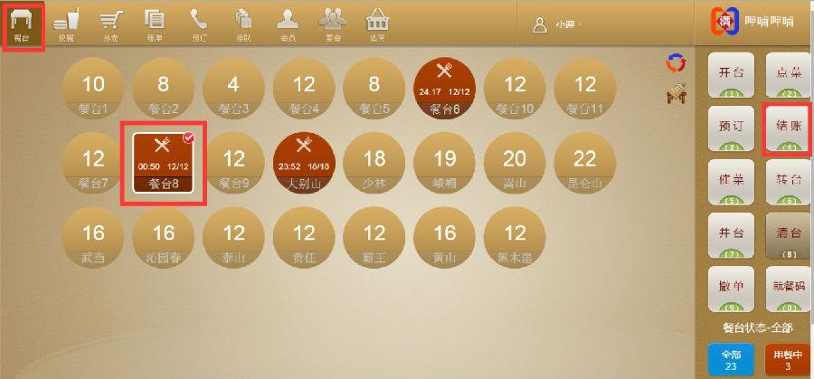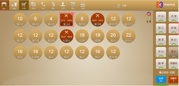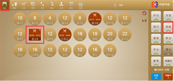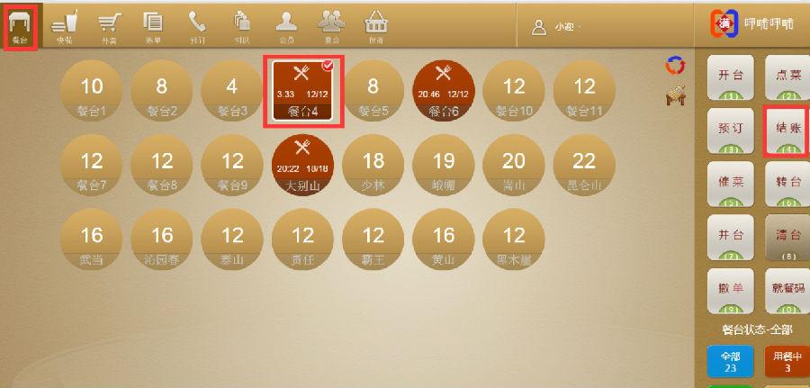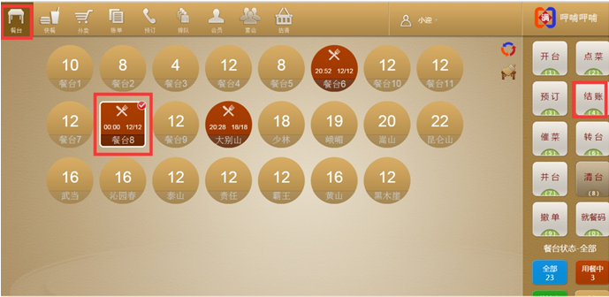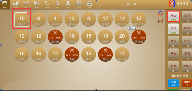 步骤一:选中一个餐台,点击【开台】
