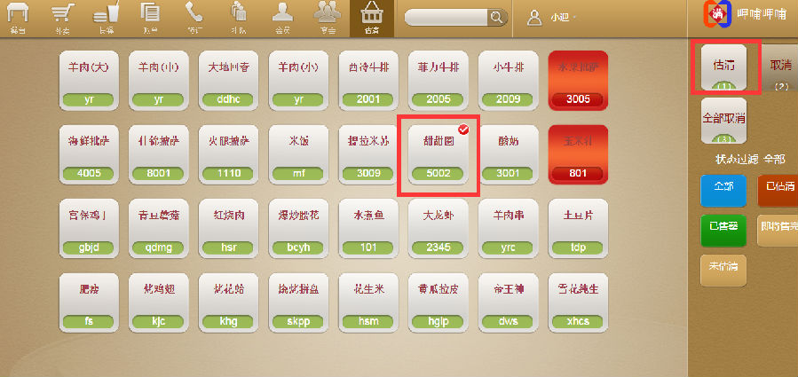 步骤一:在系统的上栏,点击估清,进入估清界面,选中估清的菜品,点击右上角的估清,输入估清菜品的数量,点击确定。