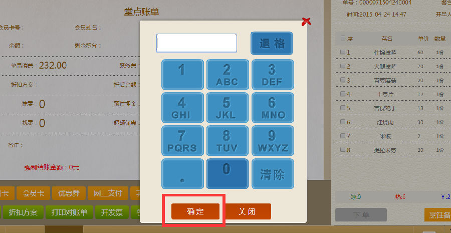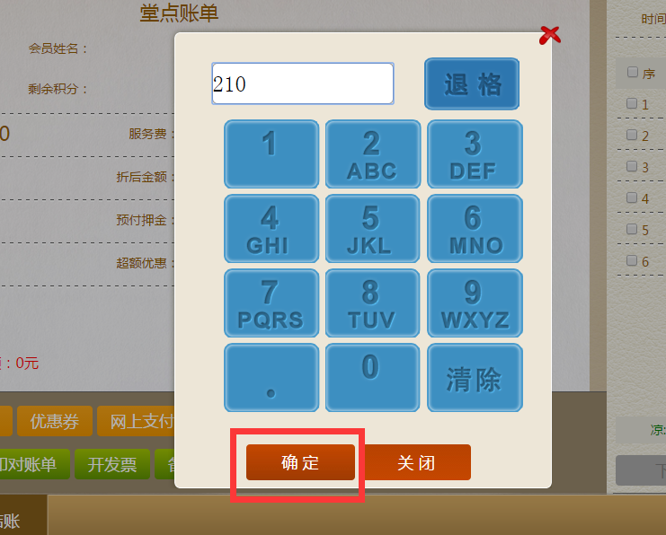 步骤二:在金额确定的界面,输入优惠券的金额,点击确定,回到堂点账单界面。