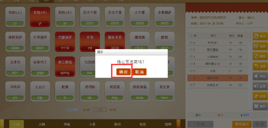 步骤一:点击要退的菜品,再点击右面的【退菜】,提示点击【确定】即可。