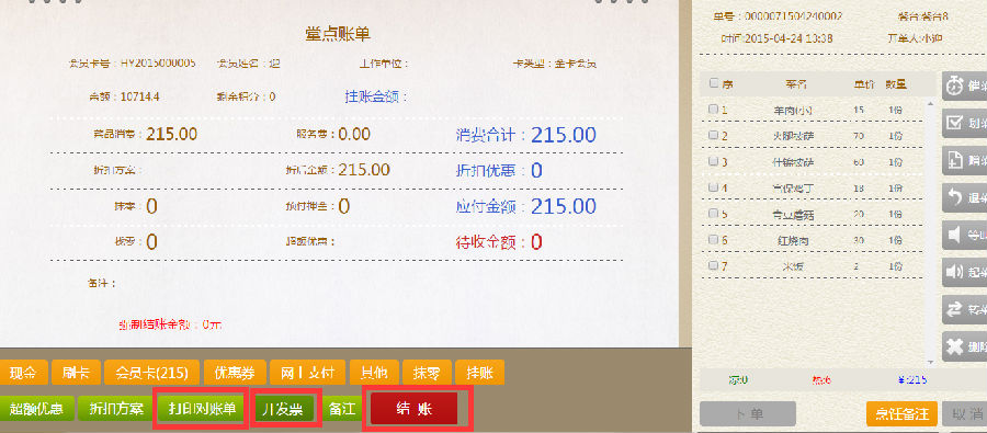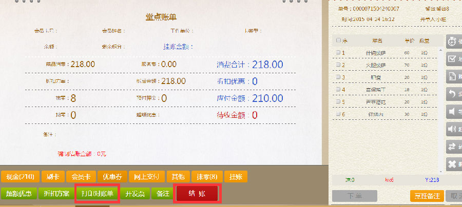 步骤四:在堂点账单界面,点击打印对账单,点击结账。