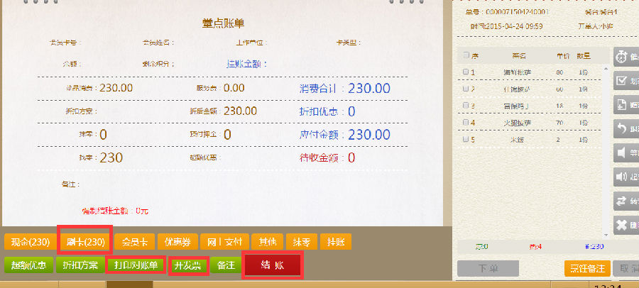 步骤二:在结账界面,选择结账方式,点击刷卡,打印对账单及发票,点击结账。