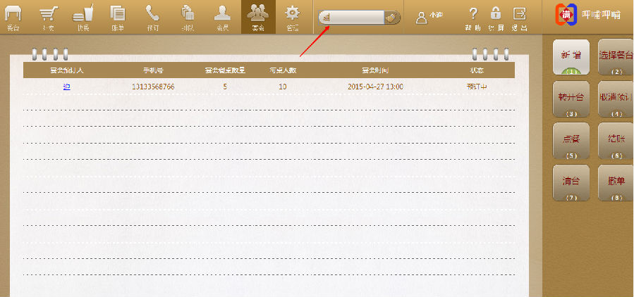 步骤二:在宴会预订界面,箭头指向的地方,输入预订人,如:宴会预订人“迎”在箭头指向的地方搜索“迎”,下方栏里就会有您搜索宴会预订人的信息界面。