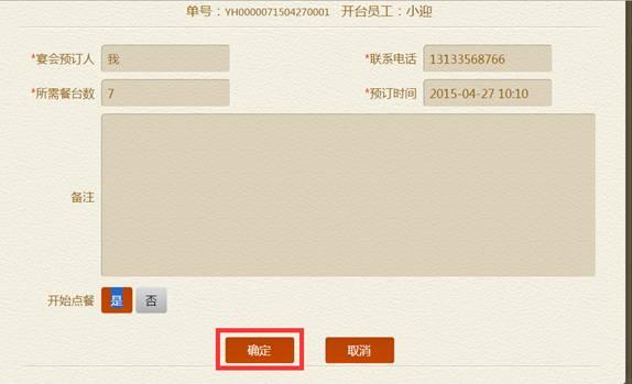 步骤三:在宴会预订信息界面,填写顾客信息,点击确定,操作成功,进入选择餐界面,★号必填。