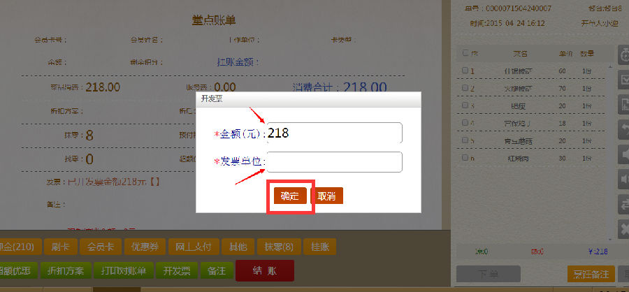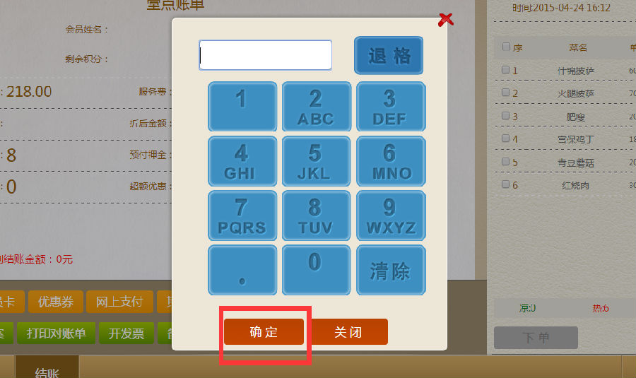 步骤三:在输入消费金额界面,填写顾客消费金额,点击确定。回到堂点账单。