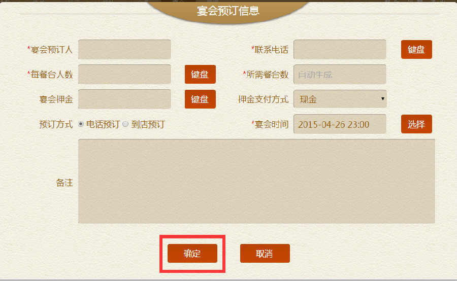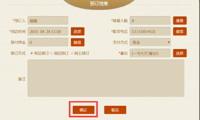 步骤二:点击新增后,输入预订信息,如预订人,电话,到店时间,就餐人数,选择餐台等,输入完后,点击【确定】