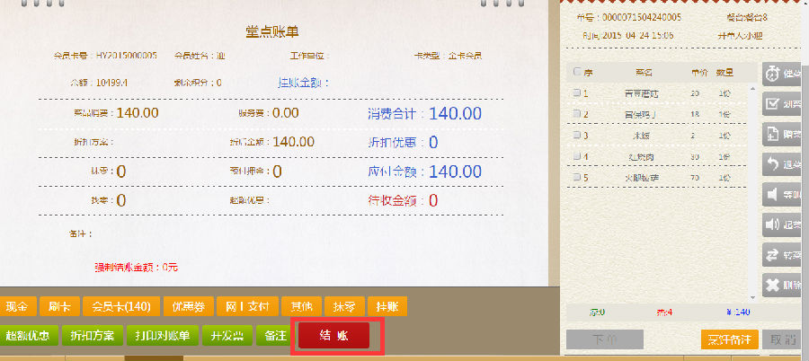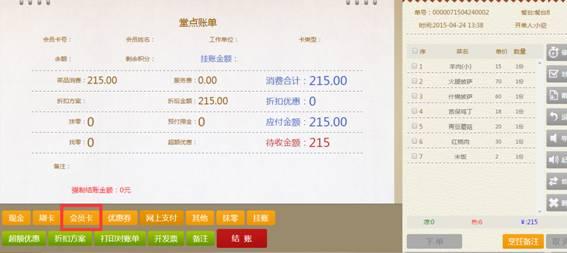 步骤二:在结账界面,选择结账方式,点击会员卡,进入会员卡结账界面。