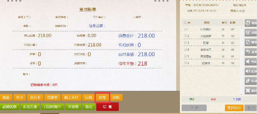 步骤一:在堂点账单界面,点击抹零,进入“输入抹零”界面。