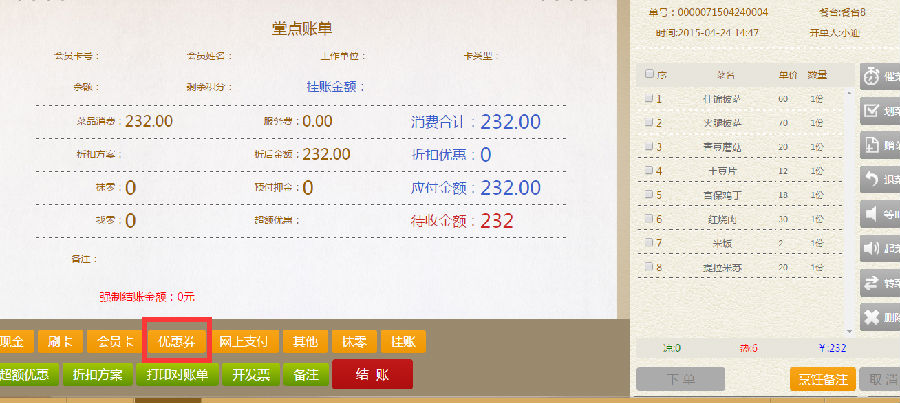 步骤一:在堂点账单界面,点击优惠券,进入优惠券的金额确定界面。