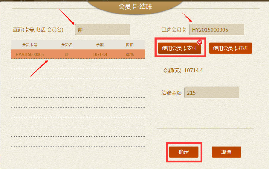 步骤三:在会员卡结账界面的左边栏里,选择顾客的会员卡号,如:迎就在左边栏里查询到后,点击到右手边已选会员卡框里,选择会员卡支付或会员卡打折,自动跳出结账金额,点击确定,回到堂点账单界面。