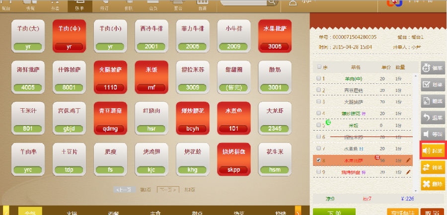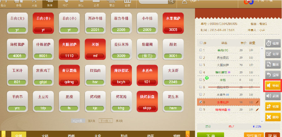 步骤一:点了菜品不着急上的话,可以设成等叫,如(水果披萨)点击右面的【等叫】即可。