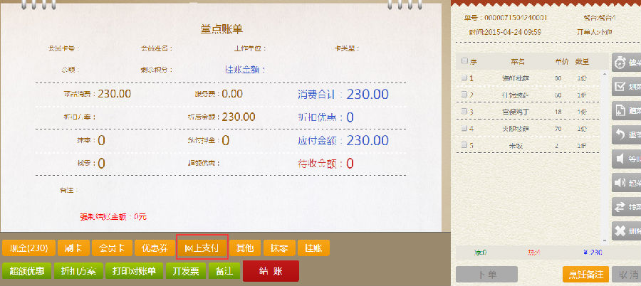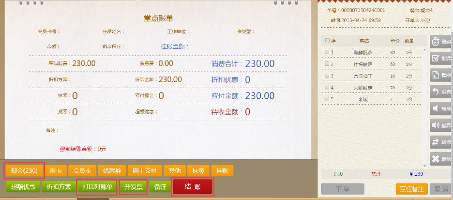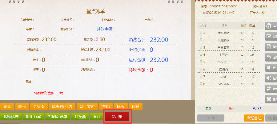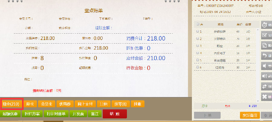 步骤三:在堂点账单界面,再选择顾客所需要的结账方式,进行结账。