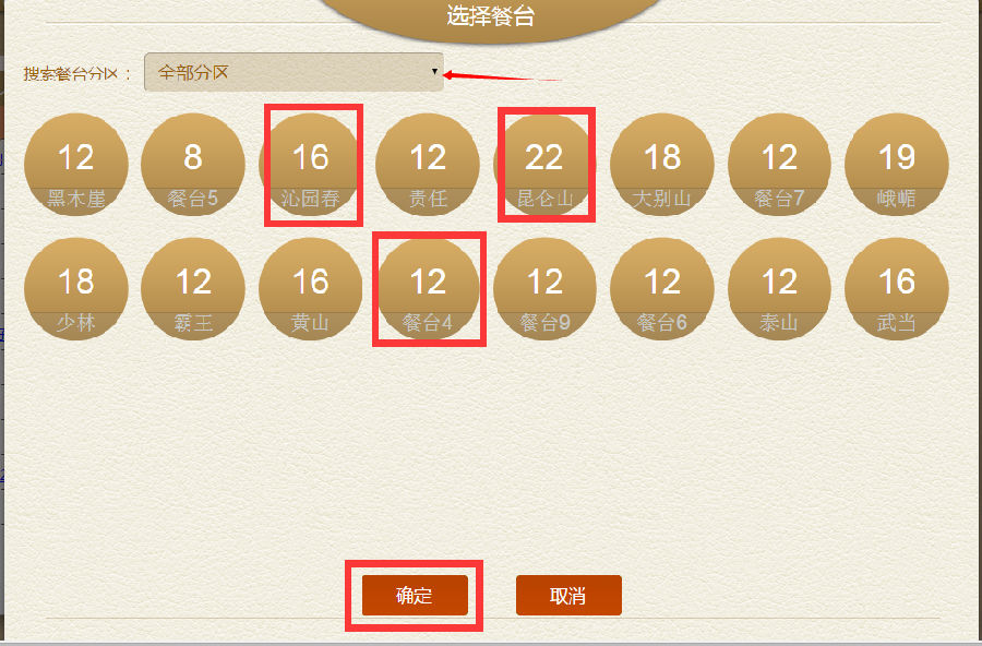 步骤四:在选择餐厅界面,点击分区,选择餐台位,可多选,点击确定,餐厅预订成功。