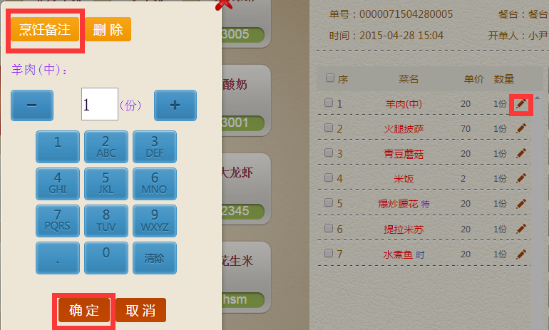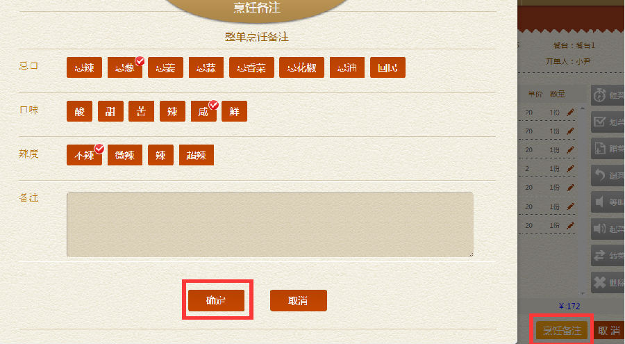 步骤二:烹饪备注也可一个一个备注,点击每个菜品的右面咖色小笔,也可添加份数,点击左上角的【烹饪备注】,选择自己喜好,打上对勾即可,点击【确定】