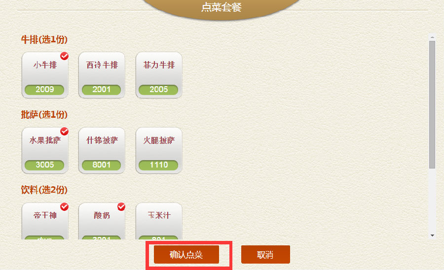 步骤一:开台点菜,如点(圣诞套餐),会出现套餐里的菜品让客人任选其一,点好后点击【确认点菜】即可。