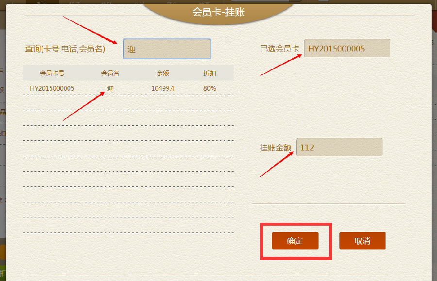 步骤二:在会员卡挂账界面的左边栏里,选择要挂账顾客的会员卡号,如:迎,就在左边栏里查询到后,点击到右手边已选会员卡框里,填写挂账金额,点击确定,回到堂点账单界面。
